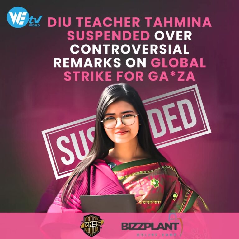 Daffodil International University has suspended lecturer Tahmina Rahman after her controversial warning to students regarding the ‘Global Strike for G’a’za’ campaign. The university confirmed the decision and stated that further action will follow official procedures.